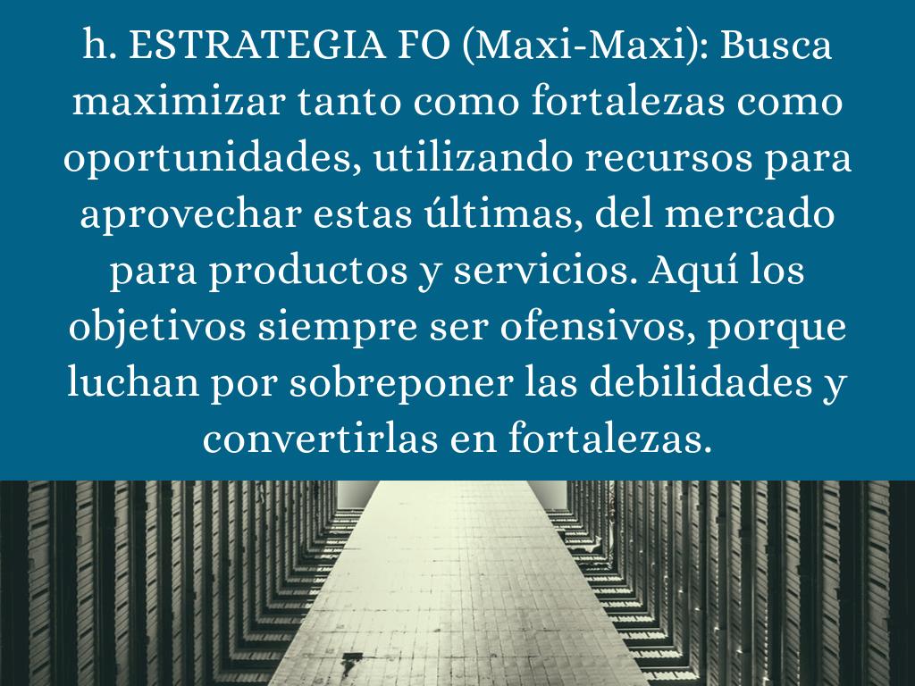 h. ESTRATEGIA FO (Maxi-Maxi): Busca maximizar tanto como fortalezas como oportunidades, utilizando recursos para aprovechar estas últimas, del mercado para productos y servicios. Aquí los objetivos siempre ser ofensivos, porque luchan por sobreponer las debilidades y convertirlas en fortalezas.