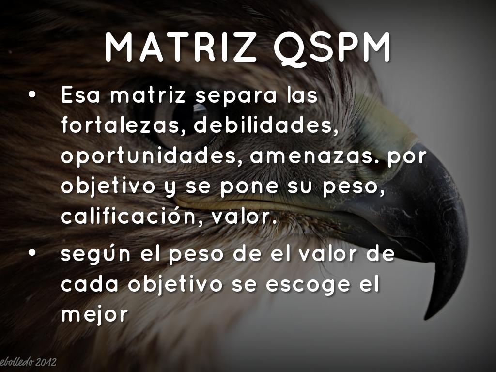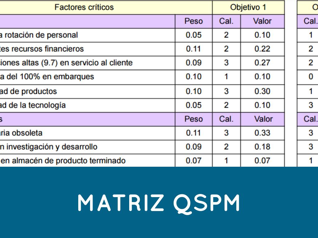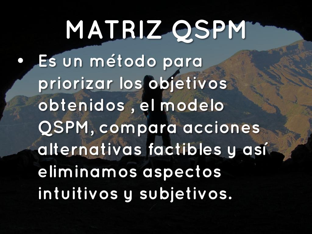 Es un método para priorizar los objetivos obtenidos , el modelo QSPM, compara acciones alternativas factibles y así eliminamos aspectos intuitivos y subjetivos.