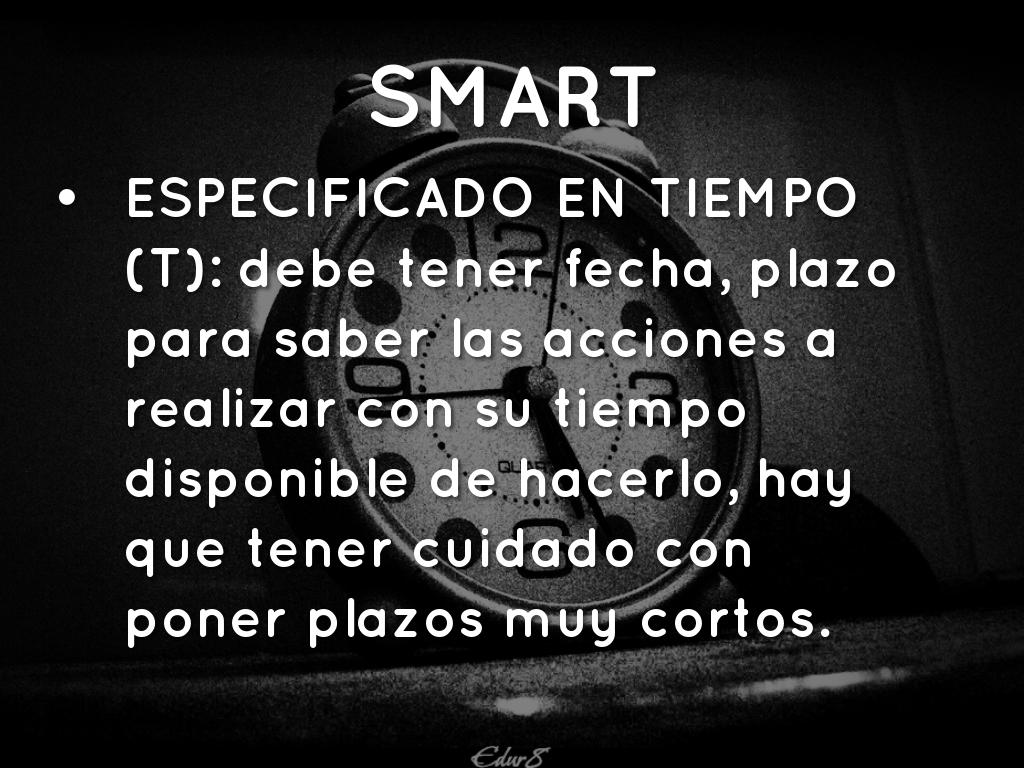 ESPECIFICADO EN TIEMPO (T): debe tener fecha, plazo para saber las acciones a realizar con su tiempo disponible de hacerlo, hay que tener cuidado con poner plazos muy cortos.
