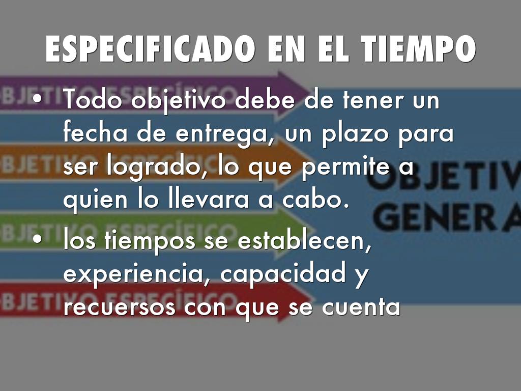 - Todo objetivo debe de tener un fecha de entrega, un plazo para ser logrado, lo que permite a quien lo llevara a cabo.