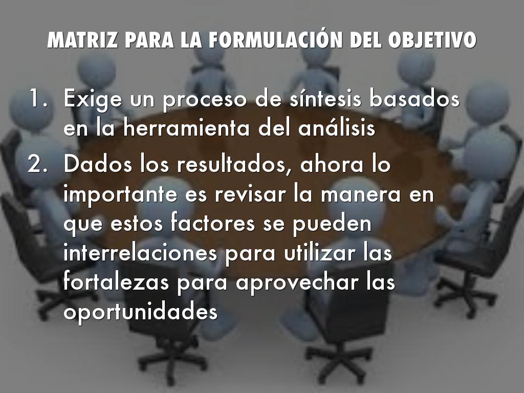 - Dados los resultados, ahora lo importante es revisar la manera en que estos factores se pueden interrelaciones para utilizar las fortalezas para aprovechar las oportunidades