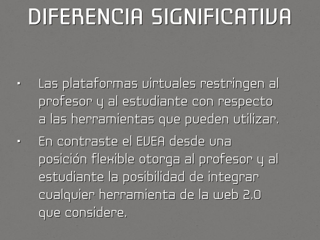 - En contraste el EVEA desde una posición flexible otorga al profesor y al estudiante la posibilidad de integrar cualquier herramienta de la web 2.0 que considere.