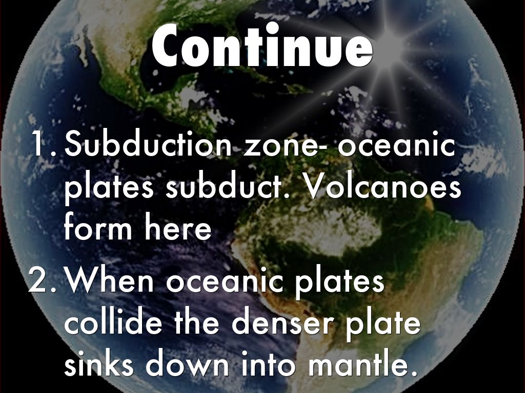 - Subduction zone- oceanic plates subduct. Volcanoes form here
