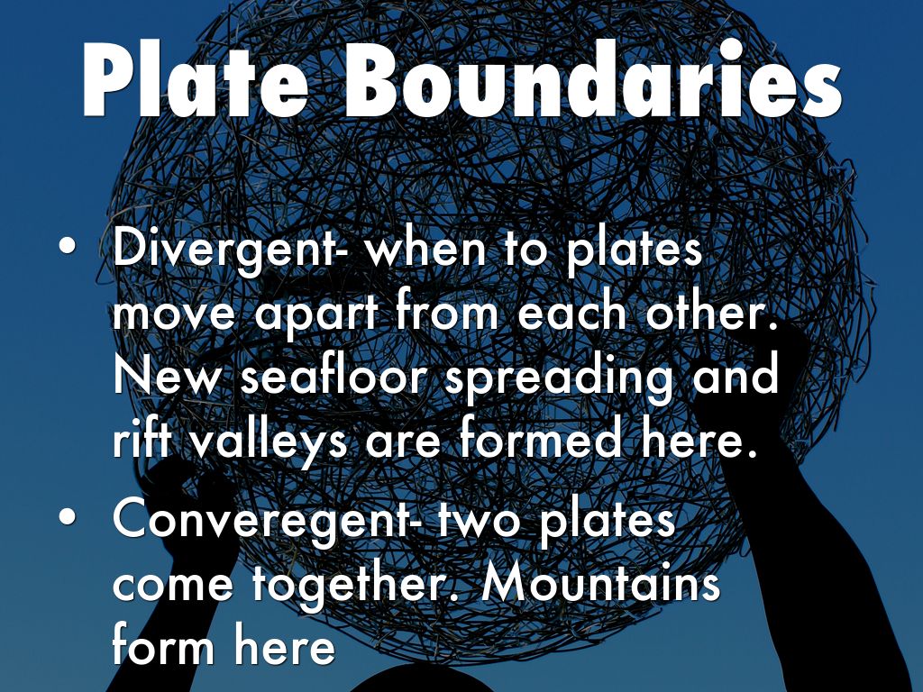 - Divergent- when to plates move apart from each other. New seafloor spreading and rift valleys are formed here.