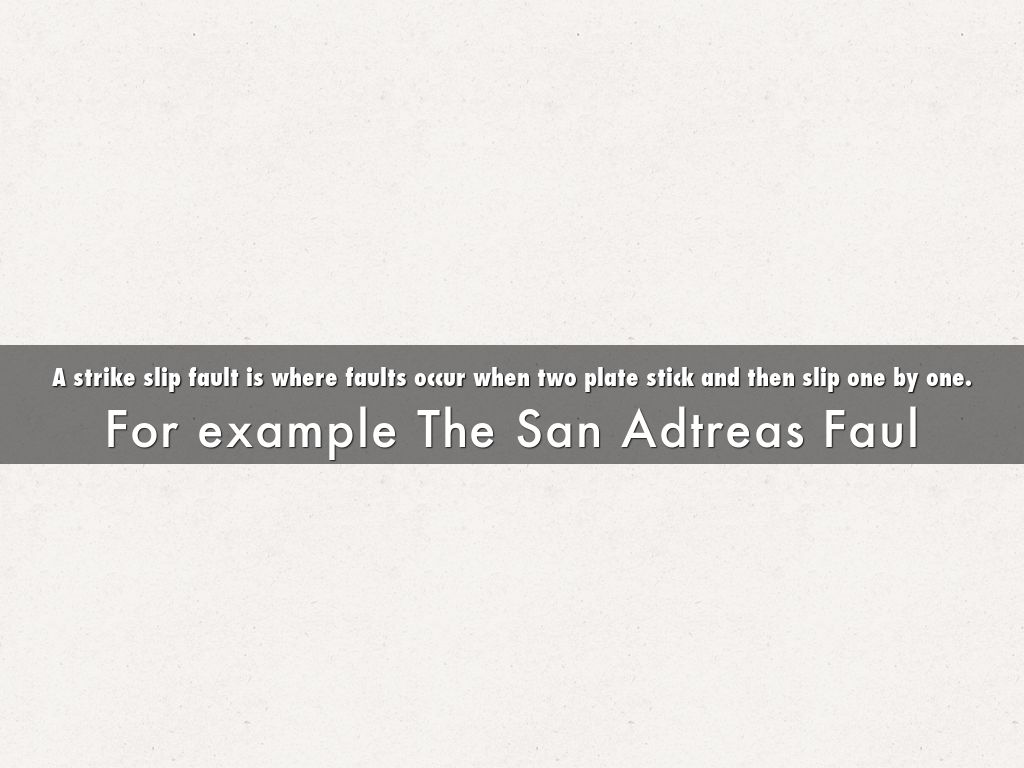 A strike slip fault is where faults occur when two plate stick and then slip one by one.