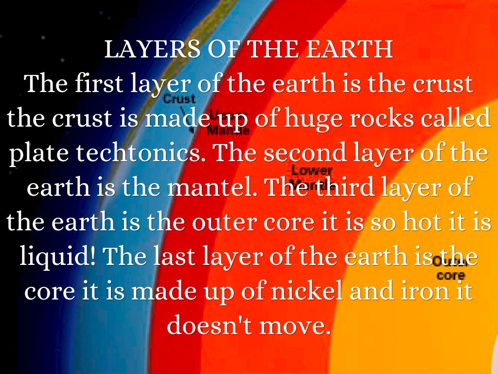 The first layer of the earth is the crust the crust is made up of huge rocks called plate techtonics. The second layer of the earth is the mantel. The third layer of the earth is the outer core it is so hot it is liquid! The last layer of the earth is the core it is made up of nickel and iron it doesn't move.