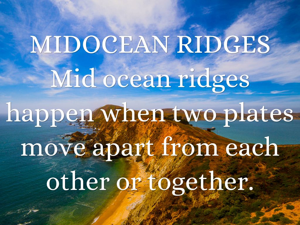 Mid ocean ridges happen when two plates move apart from each other or together.