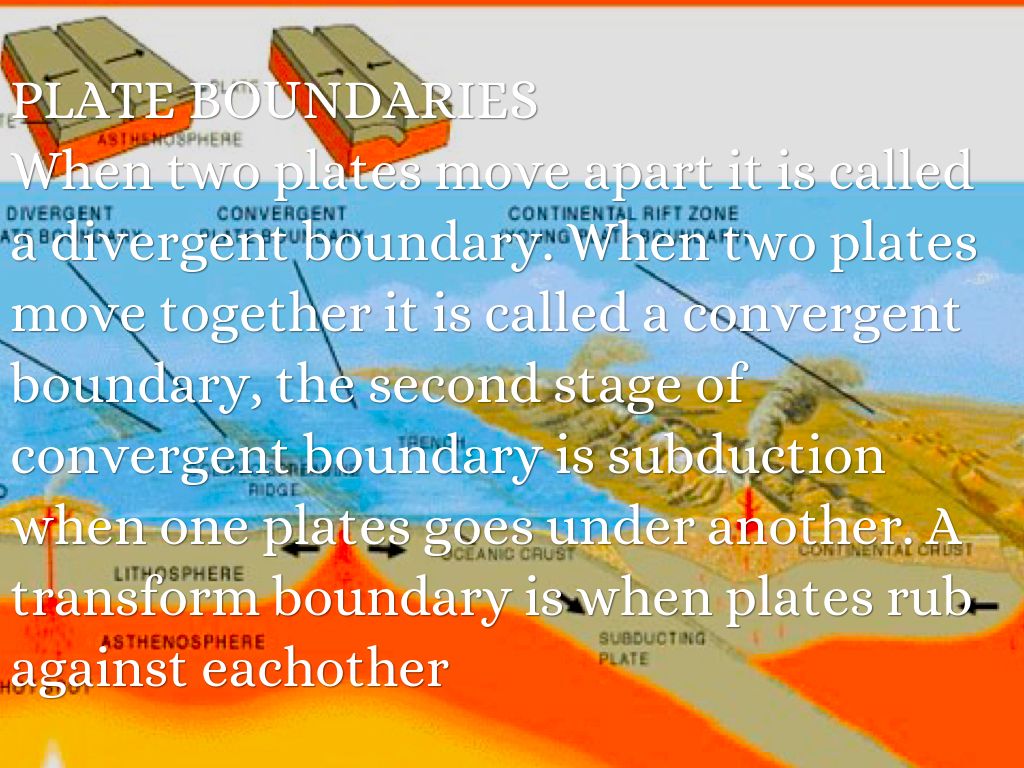 When two plates move apart it is called a divergent boundary. When two plates move together it is called a convergent boundary, the second stage of convergent boundary is subduction when one plates goes under another. A transform boundary is when plates rub against eachother
