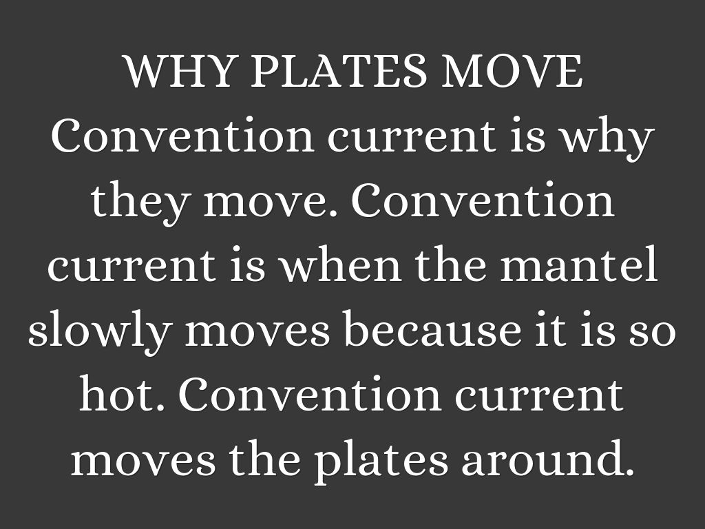 Convention current is why they move. Convention current is when the mantel slowly moves because it is so hot. Convention current moves the plates around.