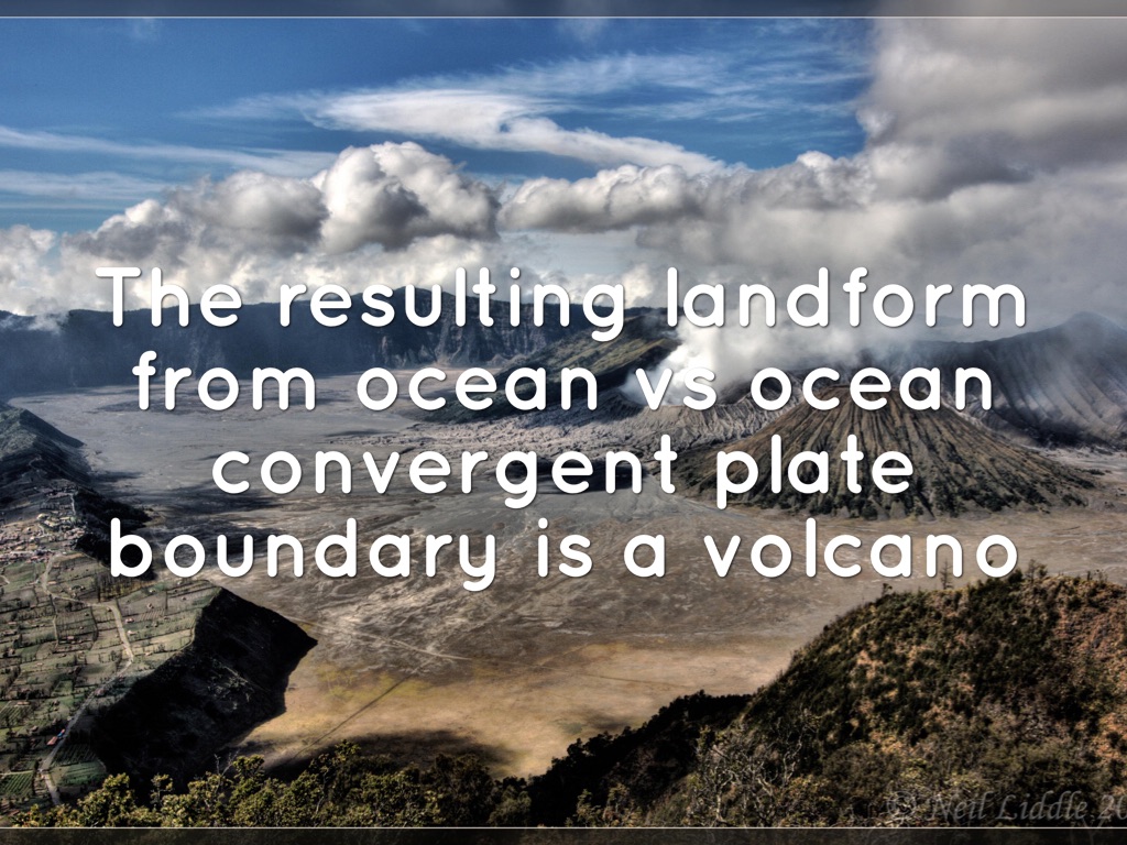 The resulting landform from ocean vs ocean convergent plate boundary is a volcano
