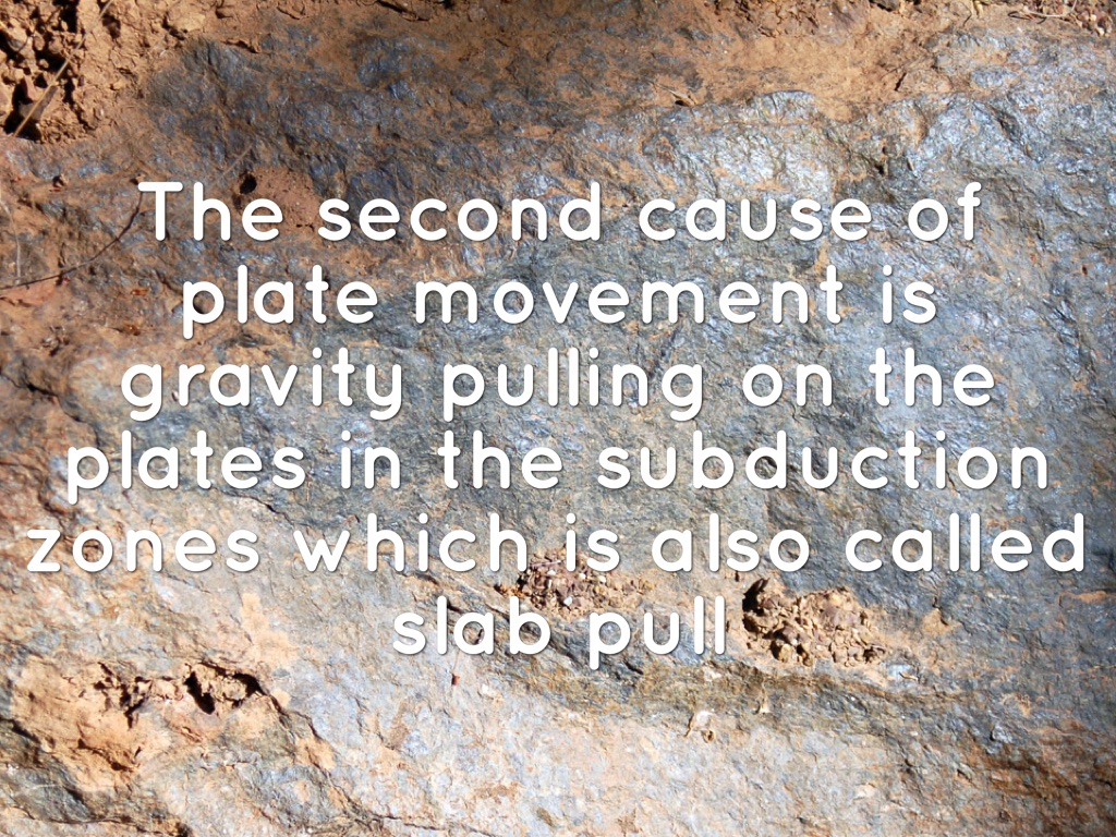 The second cause of plate movement is gravity pulling on the plates in the subduction zones which is also called slab pull