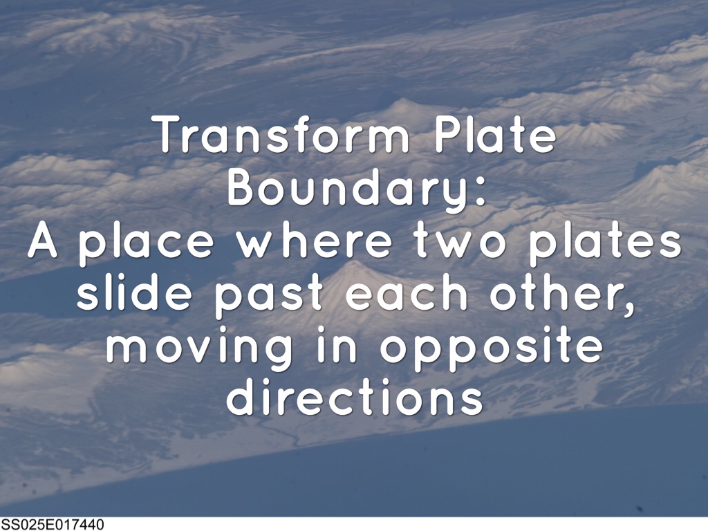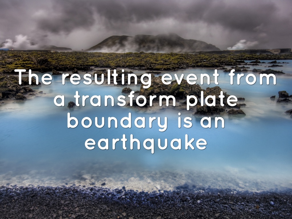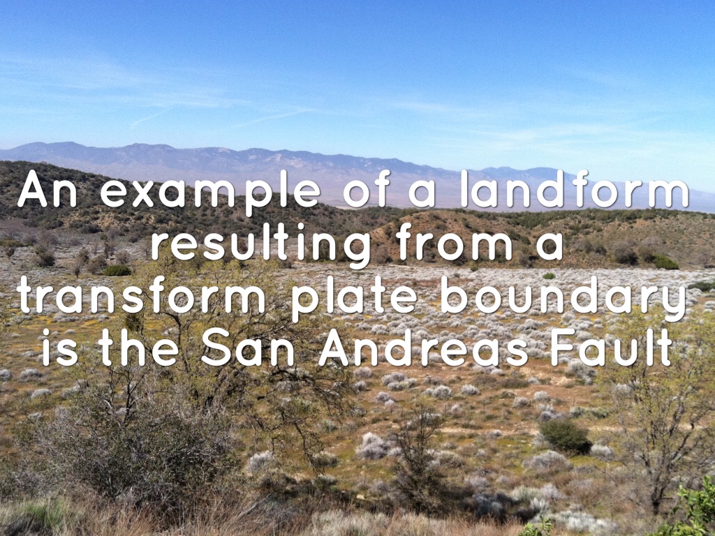 An example of a landform resulting from a transform plate boundary is the San Andreas Fault