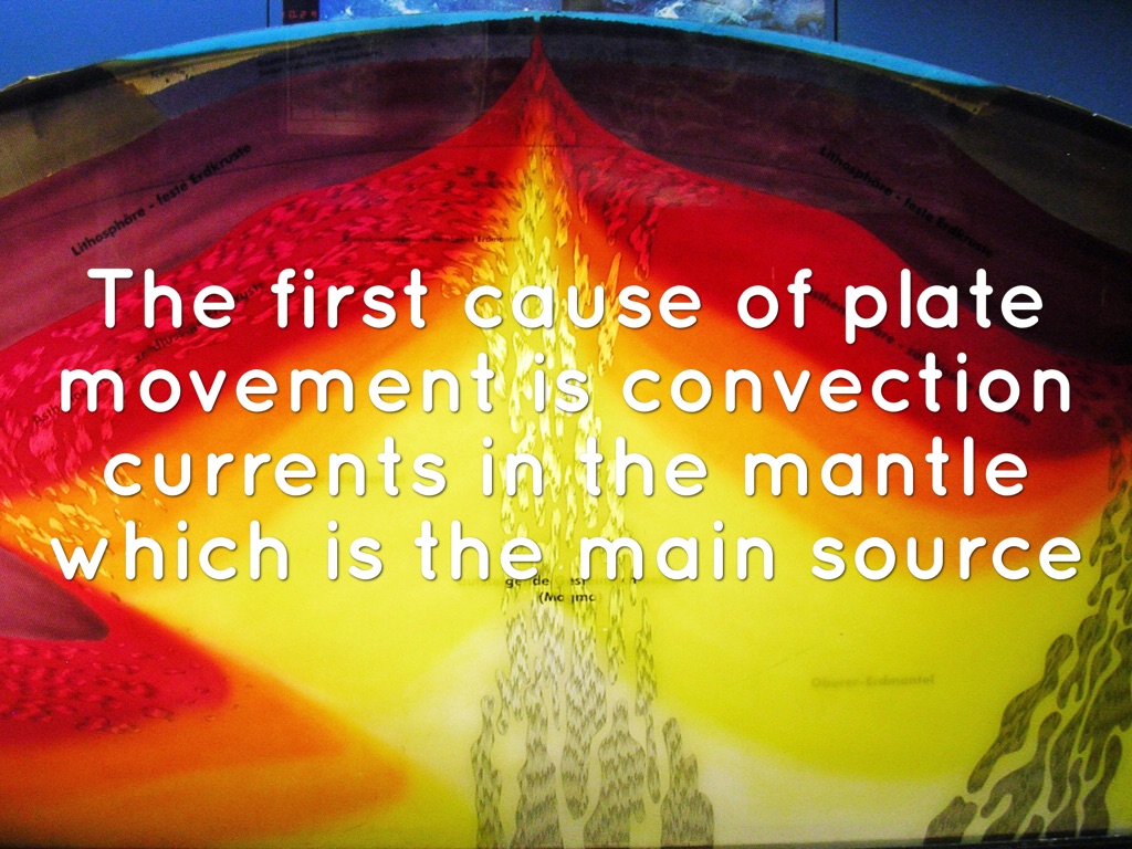 The first cause of plate movement is convection currents in the mantle which is the main source