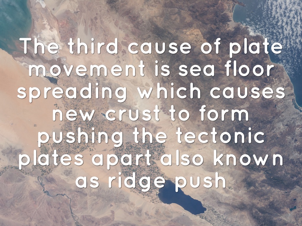 The third cause of plate movement is sea floor spreading which causes new crust to form pushing the tectonic plates apart also known as ridge push