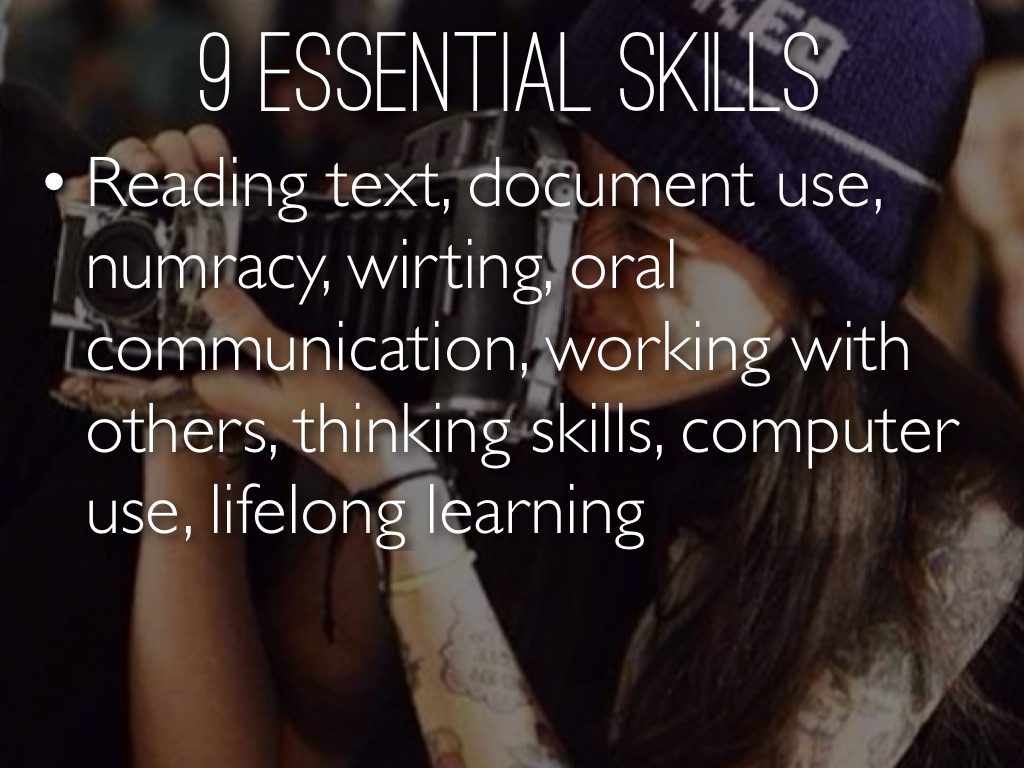 Reading text, document use, numracy, wirting, oral communication, working with others, thinking skills, computer use, lifelong learning