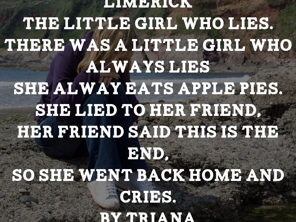 Limerick The little girl who lies. There was a little girl who always lies she alway eats Apple pies. She lied to her friend, Her friend said this is the end, So she went back home and cries. By Triana