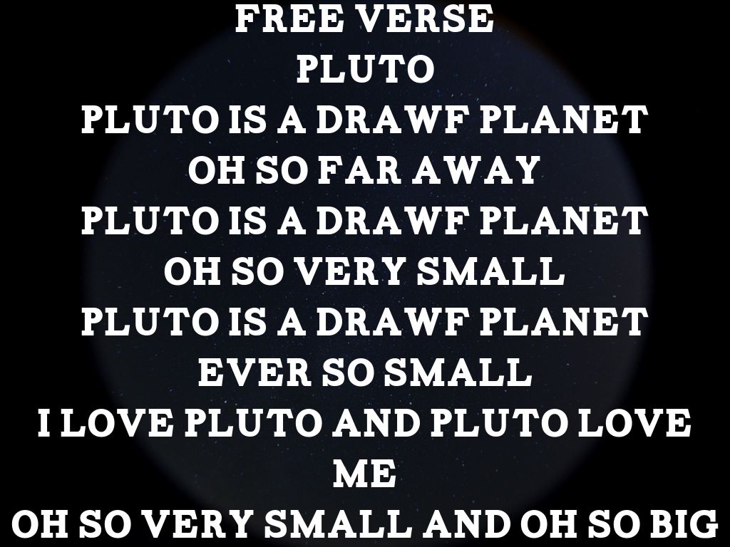 Free verse Pluto Pluto is a drawf planet Oh So far away Pluto is a drawf planet Oh So very small Pluto is a drawf planet Ever so small I love Pluto and Pluto love me Oh so very small and oh so big