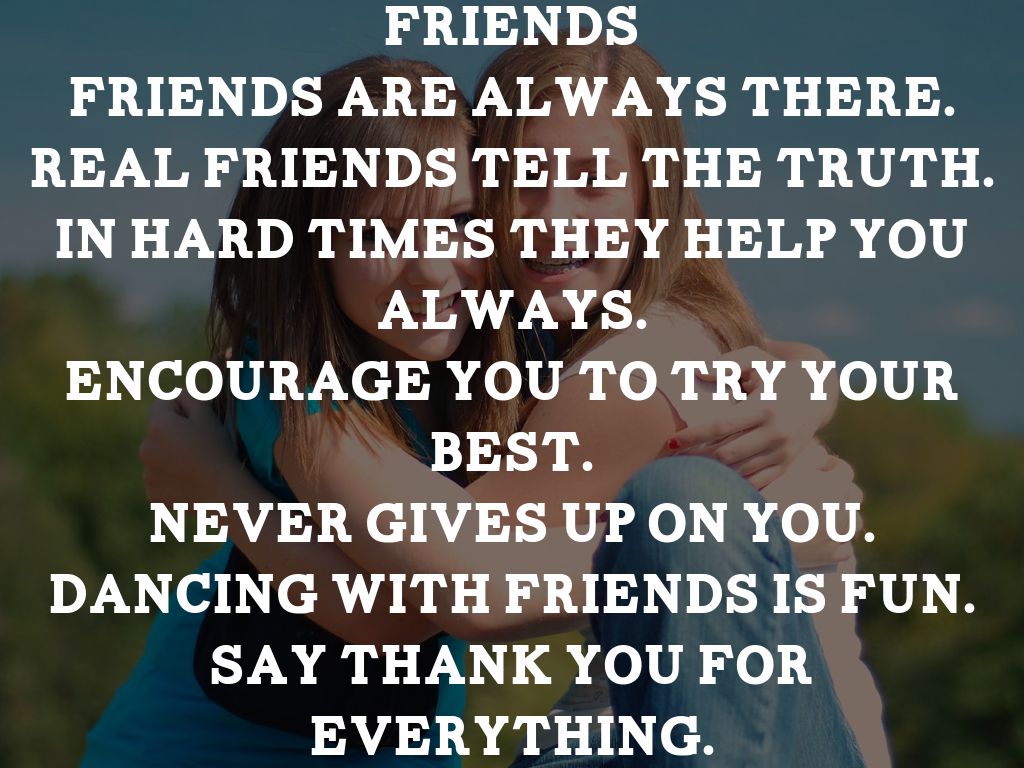 Acrostic Friends Friends are always there. Real friends tell the truth. In hard times they help you always. Encourage you to try your best. Never gives up on you. Dancing with friends is fun. Say thank you for everything. By Triana