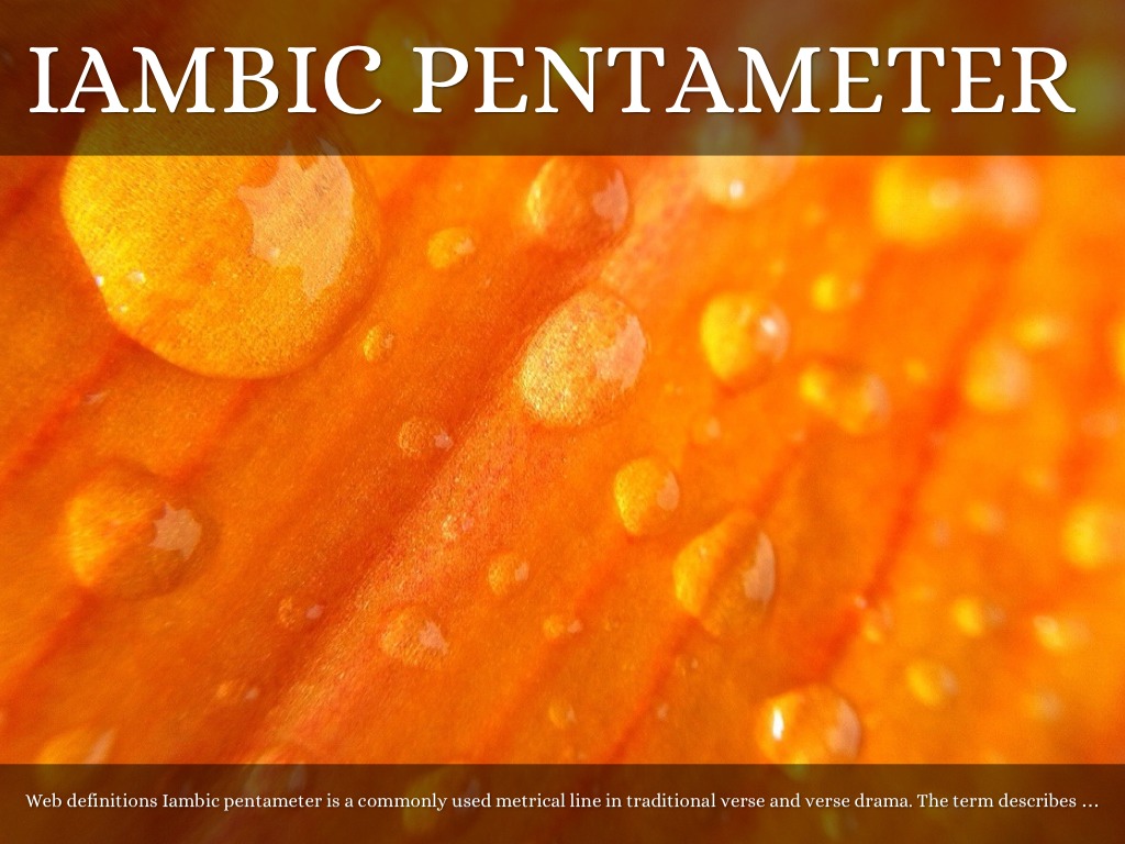 Web definitions Iambic pentameter is a commonly used metrical line in traditional verse and verse drama. The term describes the particular rhythm that...