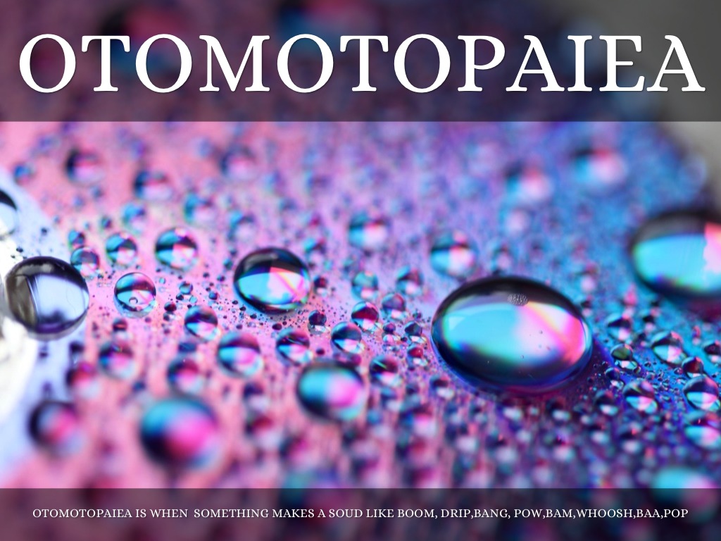 OTOMOTOPAIEA IS WHEN SOMETHING MAKES A SOUD LIKE BOOM, DRIP,BANG, POW,BAM,WHOOSH,BAA,POP
