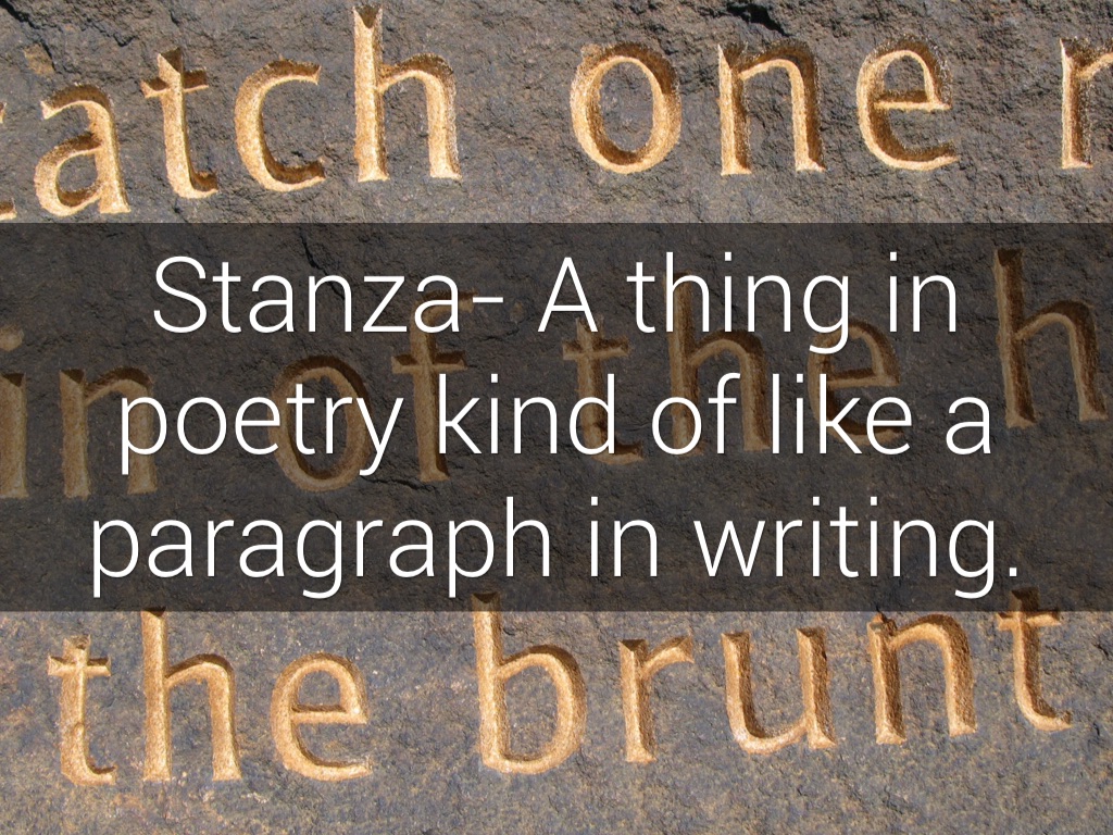 Stanza- A thing in poetry kind of like a paragraph in writing.