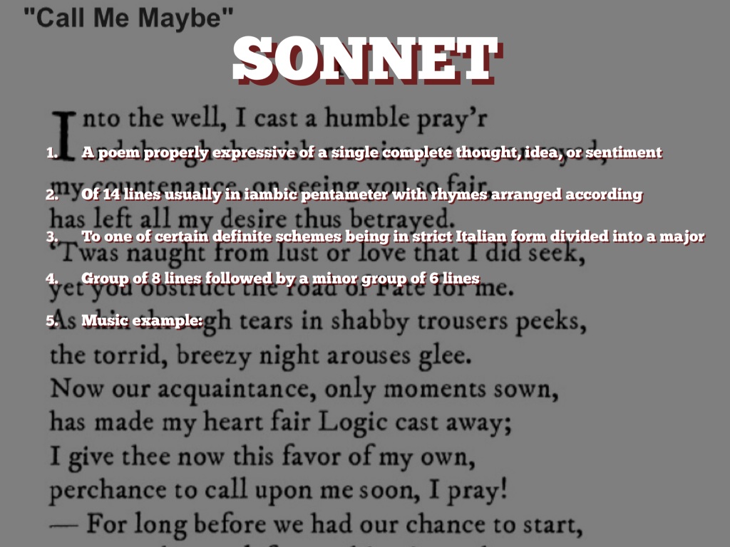 - Of 14 lines usually in iambic pentameter with rhymes arranged according