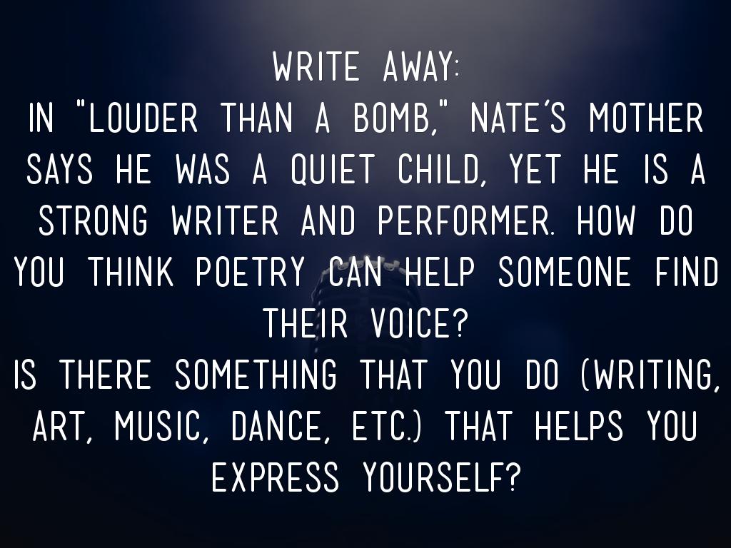 Write Away: In "Louder than a Bomb," Nate’s mother says he was a quiet child, yet he is a strong writer and performer. How do you think poetry can help someone find their voice? Is there something that you do (writing, art, music, Dance, etc.) that helps you express yourself?