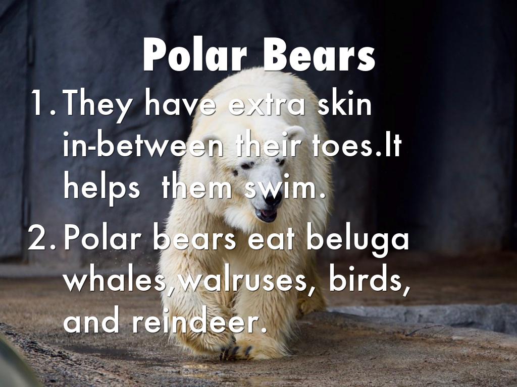 Polar bears eat beluga whales,walruses, birds, and reindeer.