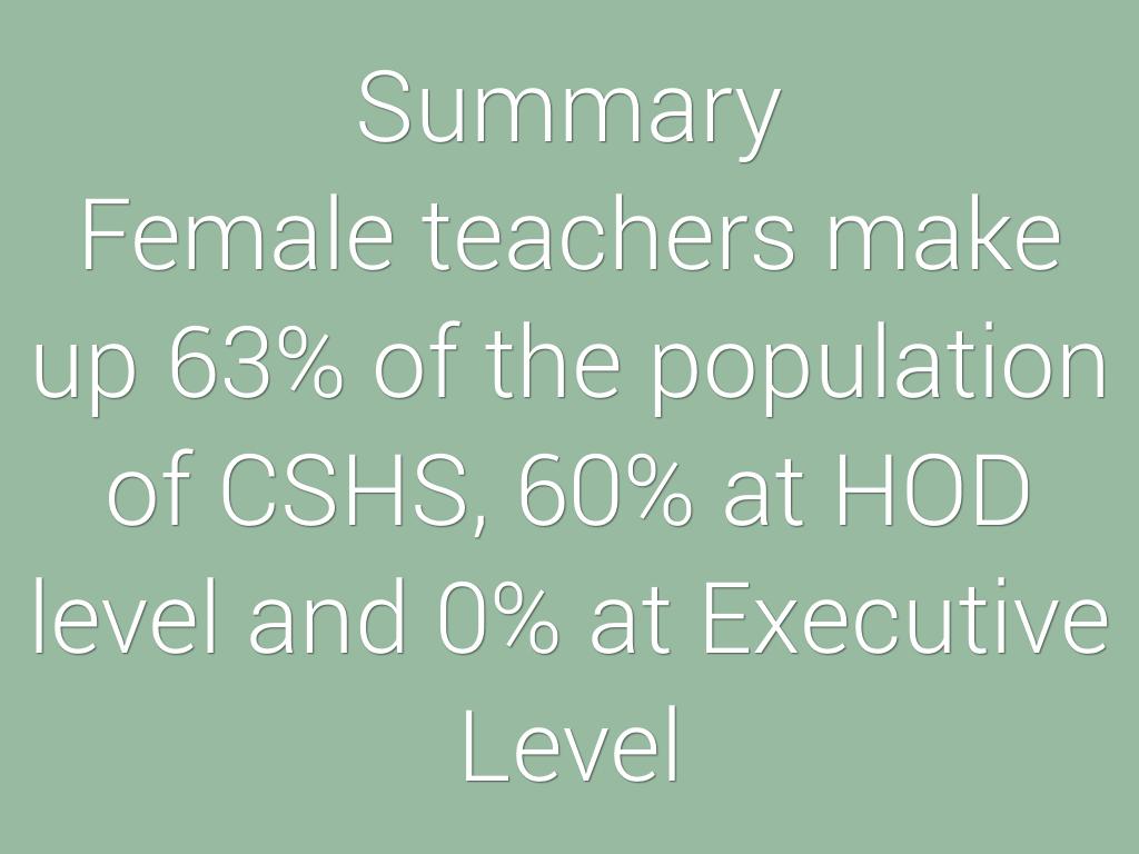 Female teachers make up 63% of the population of CSHS, 60% at HOD level and 0% at Executive Level