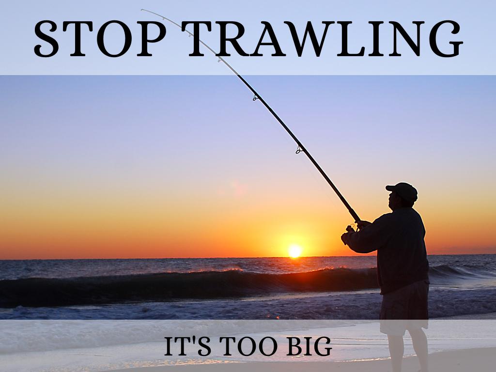 OVERFISHING: Bottom trawling is when people drag big nets from the bottom of the ocean and collect schools of fish. Bottom trawling leads to overfishing because they're killing too many fish. Bottom trawling is like taking a bulldozer and trying to chase a couple of squirrels out of a hunting area. Banning bottom trawling helps the fish recover.