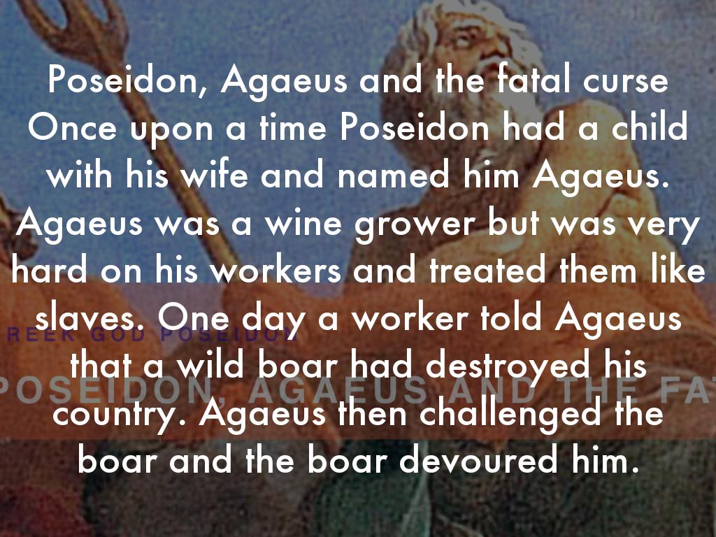 Once upon a time Poseidon had a child with his wife and named him Agaeus. Agaeus was a wine grower but was very hard on his workers and treated them like slaves. One day a worker told Agaeus that a wild boar had destroyed his country. Agaeus then challenged the boar and the boar devoured him.