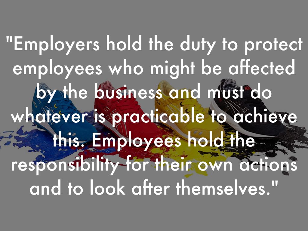 "Employers hold the duty to protect employees who might be affected by the business and must do whatever is practicable to achieve this. Employees hold the responsibility for their own actions and to look after themselves."