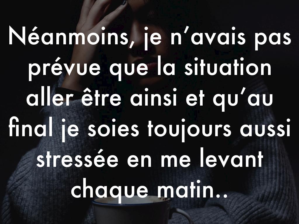 Néanmoins, je n’avais pas prévue que la situation aller être ainsi et qu’au final je soies toujours aussi stressée en me levant chaque matin..