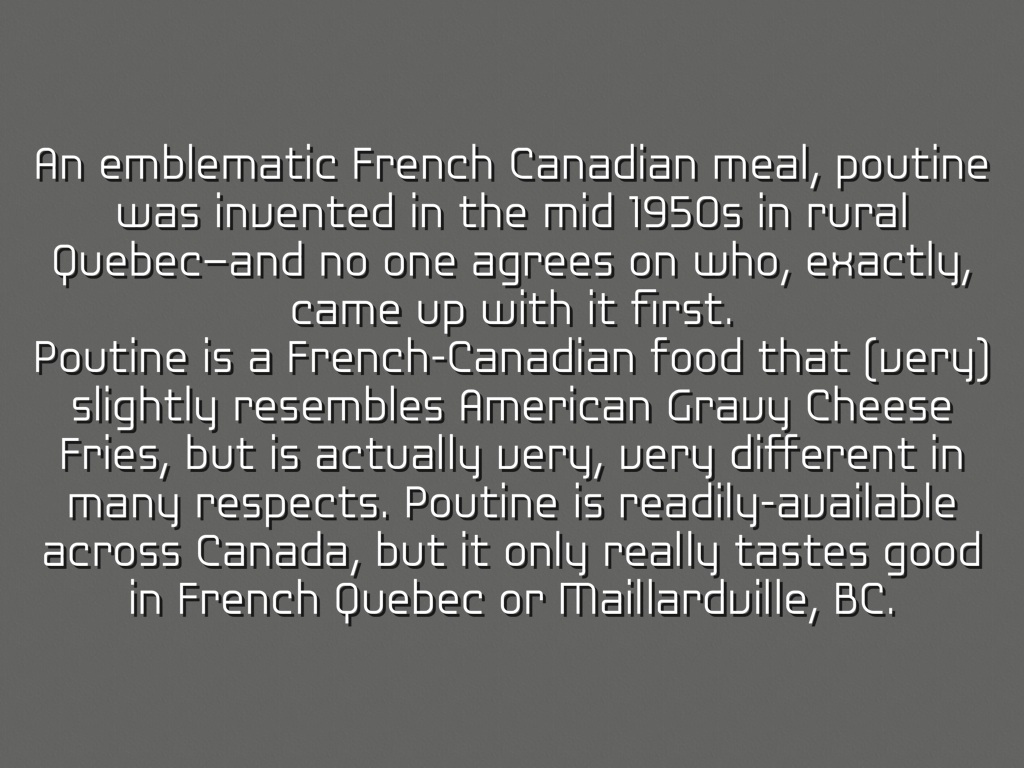 Poutine is a French-Canadian food that (very) slightly resembles American Gravy Cheese Fries, but is actually very, very different in many respects. Poutine is readily-available across Canada, but it only really tastes good in French Quebec or Maillardville, BC.