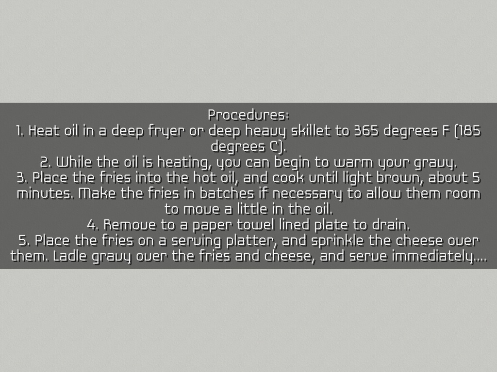 5. Place the fries on a serving platter, and sprinkle the cheese over them. Ladle gravy over the fries and cheese, and serve immediately.