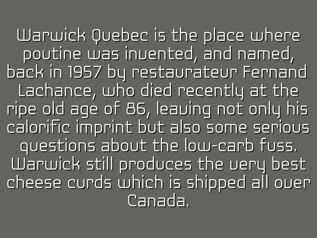 Warwick Quebec is the place where poutine was invented, and named, back in 1957 by restaurateur Fernand Lachance, who died recently at the ripe old age of 86, leaving not only his calorific imprint but also some serious questions about the low-carb fuss. Warwick still produces the very best cheese curds which is shipped all over Canada.