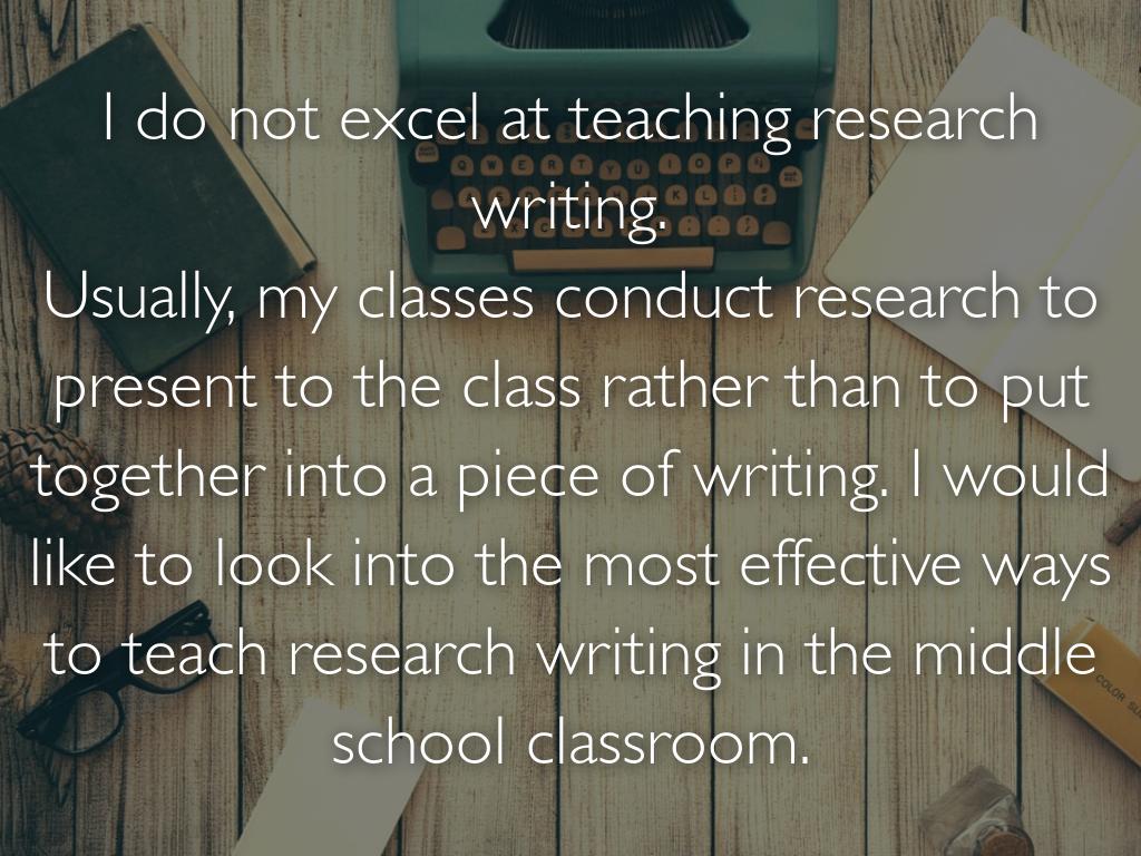 I do not excel at teaching research writing. Usually, my classes conduct research to present to the class rather than to put together into a piece of writing. I would like to look into the most effective ways to teach research writing in the middle school classroom.