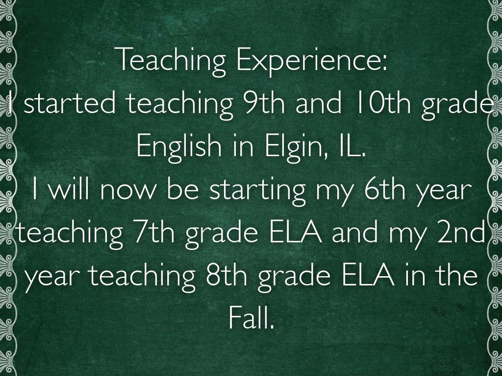 Teaching Experience: I started teaching 9th and 10th grade English in Elgin, IL. I will now be starting my 6th year teaching 7th grade ELA and my 2nd year teaching 8th grade ELA in the Fall.