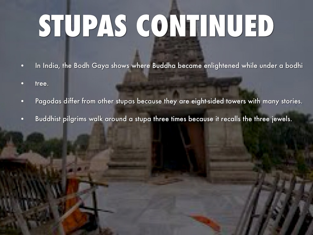 In India, the Bodh Gaya shows where Buddha became enlightened while under a bodhi