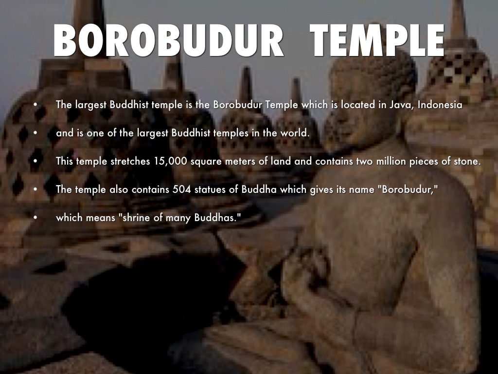 The largest Buddhist temple is the Borobudur Temple which is located in Java, Indonesia