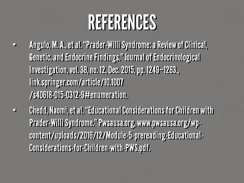 Angulo, M. A., et al. “Prader-Willi Syndrome: a Review of Clinical, Genetic, and Endocrine Findings.” Journal of Endocrinological Investigation, vol. 38, no. 12, Dec. 2015, pp. 1249–1263., link.springer.com/article/10.1007/s40618-015-0312-9#enumeration.