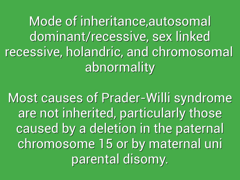 Most causes of Prader-Willi syndrome are not inherited, particularly those caused by a deletion in the paternal chromosome 15 or by maternal uni parental disomy.