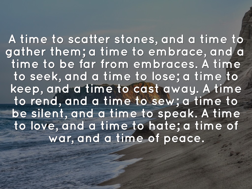 A time to scatter stones, and a time to gather them; a time to embrace, and a time to be far from embraces. A time to seek, and a time to lose; a time to keep, and a time to cast away. A time to rend, and a time to sew; a time to be silent, and a time to speak. A time to love, and a time to hate; a time of war, and a time of peace.