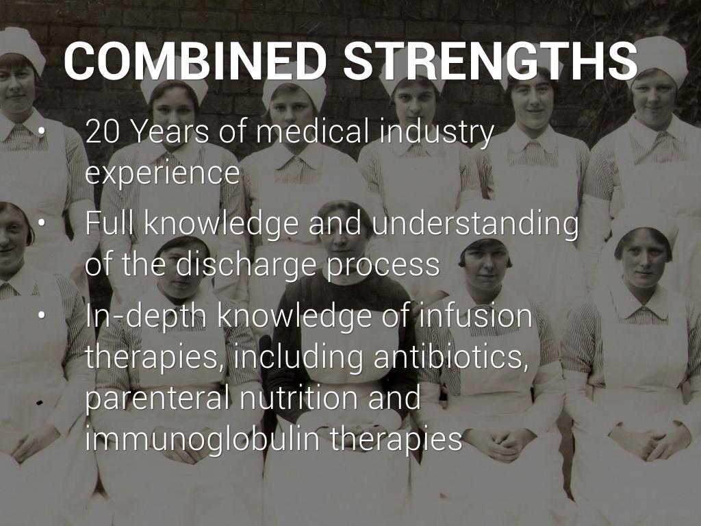 In-depth knowledge of infusion therapies, including antibiotics, parenteral nutrition and immunoglobulin therapies