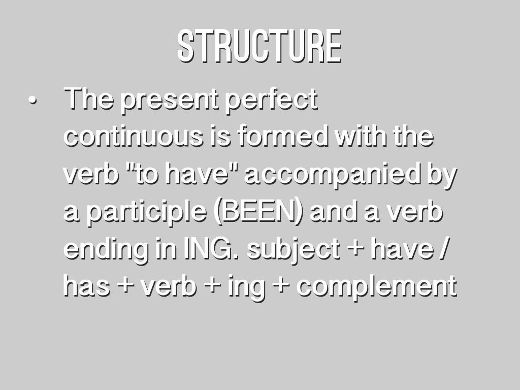 • The present perfect continuous is formed with the verb "to have" accompanied by a participle (BEEN) and a verb ending in ING. subject + have / has + verb + ing + complement
