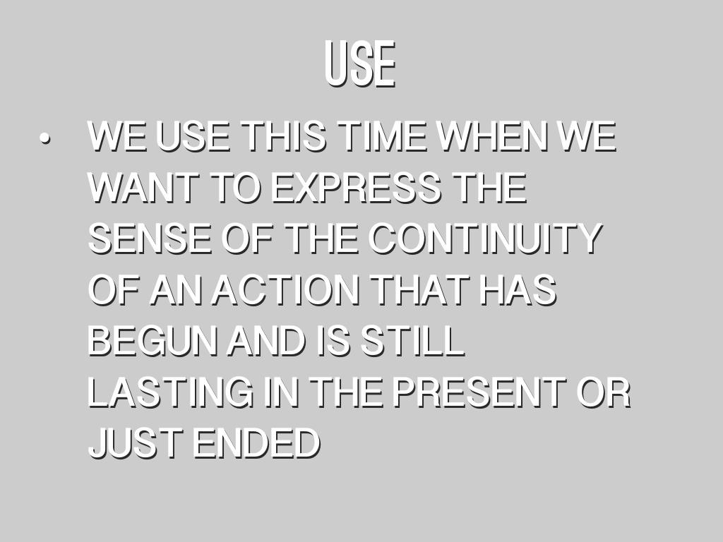 • WE USE THIS TIME WHEN WE WANT TO EXPRESS THE SENSE OF THE CONTINUITY OF AN ACTION THAT HAS BEGUN AND IS STILL LASTING IN THE PRESENT OR JUST ENDED