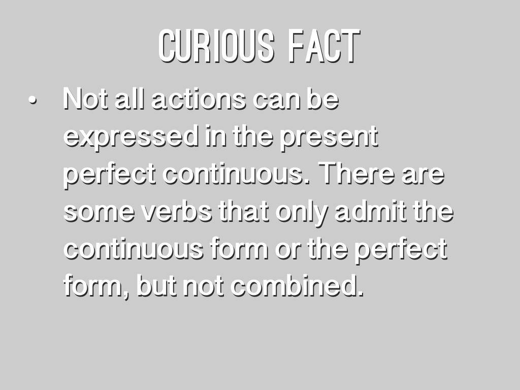 • Not all actions can be expressed in the present perfect continuous. There are some verbs that only admit the continuous form or the perfect form, but not combined.