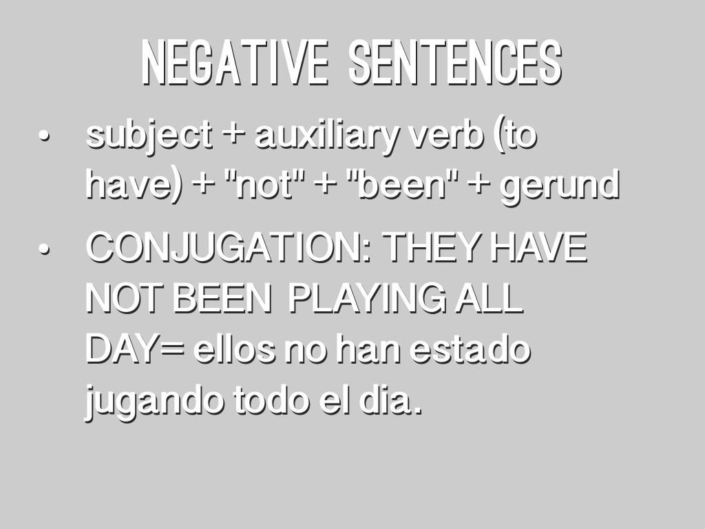 • CONJUGATION: THEY HAVE NOT BEEN PLAYING ALL DAY= ellos no han estado jugando todo el dia.