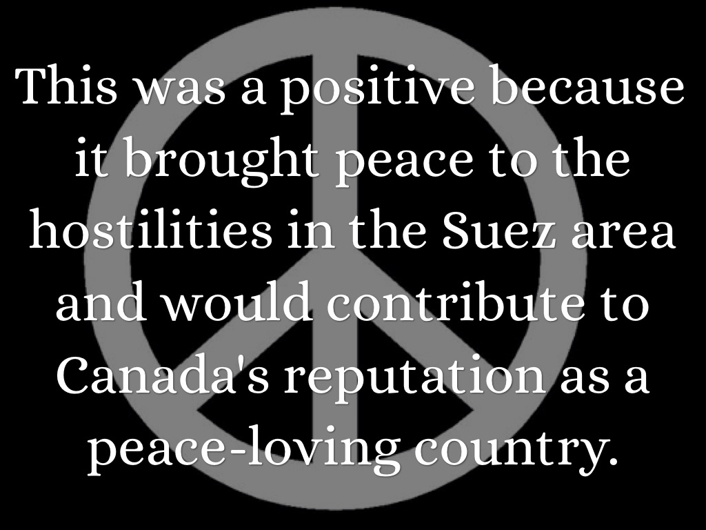 This was a positive because it brought peace to the hostilities in the Suez area and would contribute to Canada's reputation as a peace-loving country.