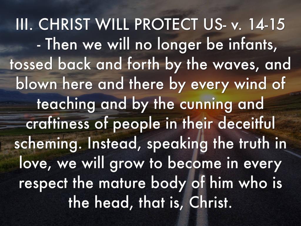 III. CHRIST WILL PROTECT US- v. 14-15 - Then we will no longer be infants, tossed back and forth by the waves, and blown here and there by every wind of teaching and by the cunning and craftiness of people in their deceitful scheming. Instead, speaking the truth in love, we will grow to become in every respect the mature body of him who is the head, that is, Christ.